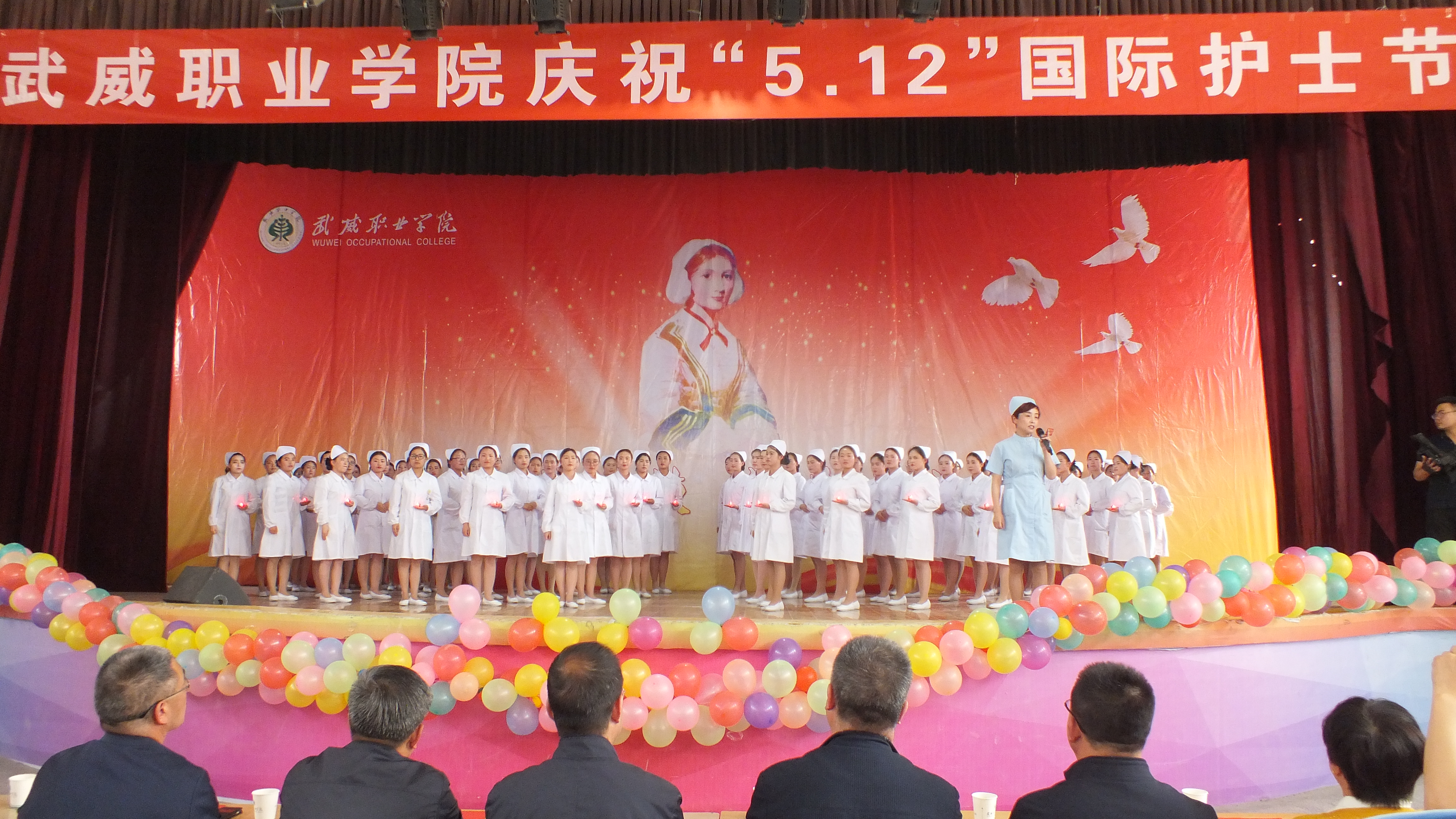 為了繼承和弘揚(yáng)南丁格爾精神,展示護(hù)理系師生良好精神風(fēng)貌和職業(yè)風(fēng)范,5.11日下午學(xué)院在大禮堂舉辦了“5.12”國(guó)際護(hù)士節(jié)慶?;顒?dòng),學(xué)院黨委副書(shū)記趙明、副院長(zhǎng)翟存祥以及宣傳統(tǒng)戰(zhàn)部、學(xué)生工作處、教務(wù)處、院團(tuán)委、藥學(xué)系、醫(yī)技系領(lǐng)導(dǎo)及護(hù)理系全體師生1200余人參與了本次活動(dòng)。