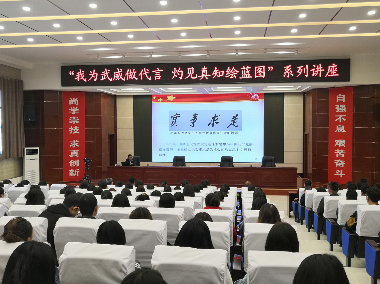 3月16日,武威職業(yè)學(xué)院“綠洲講壇”第12期在學(xué)院菁英廳舉行,本期活動(dòng)邀請(qǐng)到中國(guó)社科院哲學(xué)研究所副研究員、民勤縣委副書(shū)記周丹作主題為《掌握看家本領(lǐng) 堅(jiān)定理想信念》的報(bào)告。學(xué)院領(lǐng)導(dǎo)班子、中層干部、師生代表220余人參加了報(bào)告會(huì)。