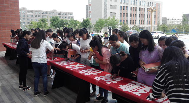 6月14日是第九個(gè)全國(guó)“信用記錄關(guān)愛日”。為進(jìn)一步加強(qiáng)我院學(xué)生的誠(chéng)信教育,結(jié)合當(dāng)前學(xué)院正在進(jìn)行的社會(huì)信用體系建設(shè)及國(guó)家助學(xué)貸款工作,當(dāng)日中午12時(shí),學(xué)生工作處在大學(xué)生活動(dòng)中心廣場(chǎng)發(fā)起“創(chuàng)建誠(chéng)信校園 樹立誠(chéng)信學(xué)風(fēng) 做誠(chéng)信學(xué)子”的主題簽名倡議活動(dòng)。200多名學(xué)生頂著炎炎烈日前來參加簽名活動(dòng),并在橫幅上鄭重簽下了自己的名字。