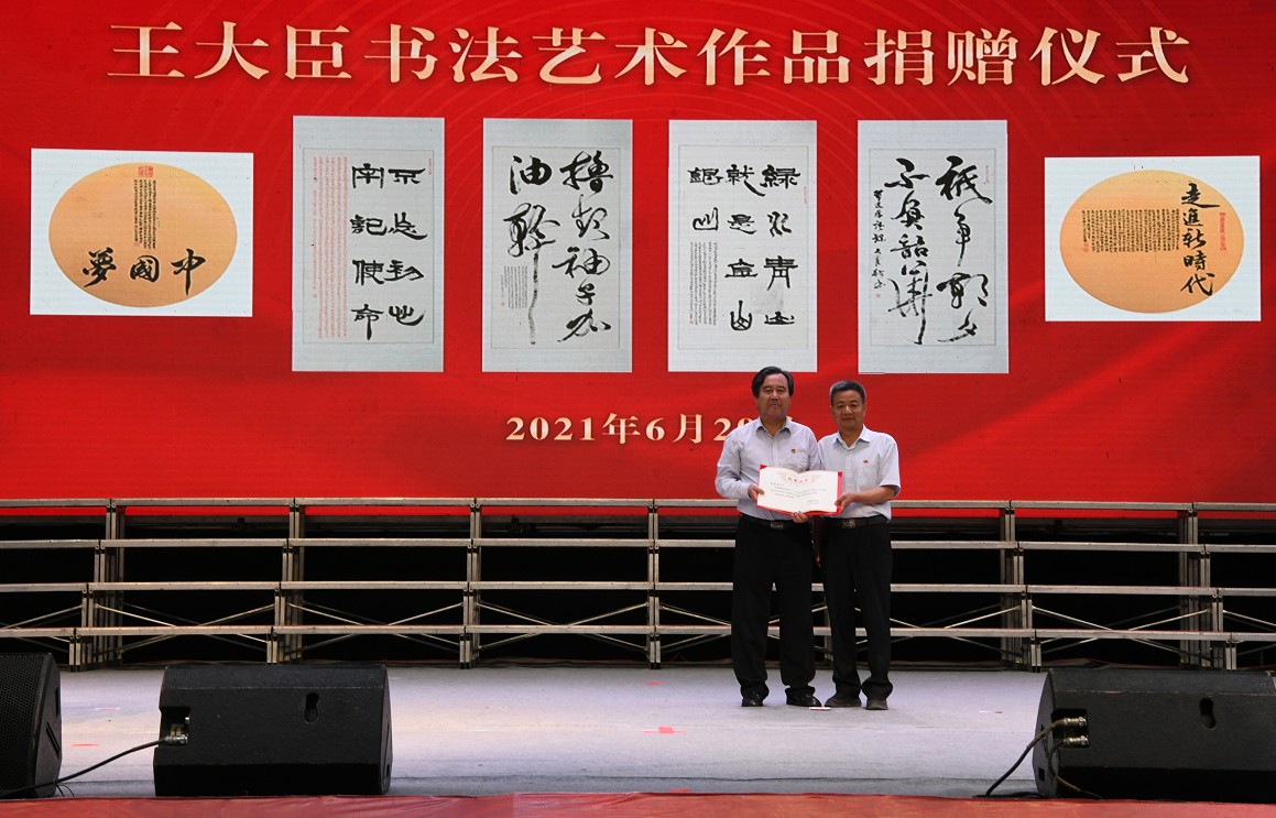 之后舉行了王大臣先生書法藝術(shù)作品捐贈(zèng)儀式,學(xué)院黨委書記、院長趙明教授為王大臣先生頒發(fā)《收藏證書》。王大臣先生自愿將140多件書法藝術(shù)作品無償捐贈(zèng)給我們學(xué)院,給我們留下了寶貴的精神財(cái)富,讓作品中蘊(yùn)含的紅色基因薪火相傳、血脈永續(xù)!