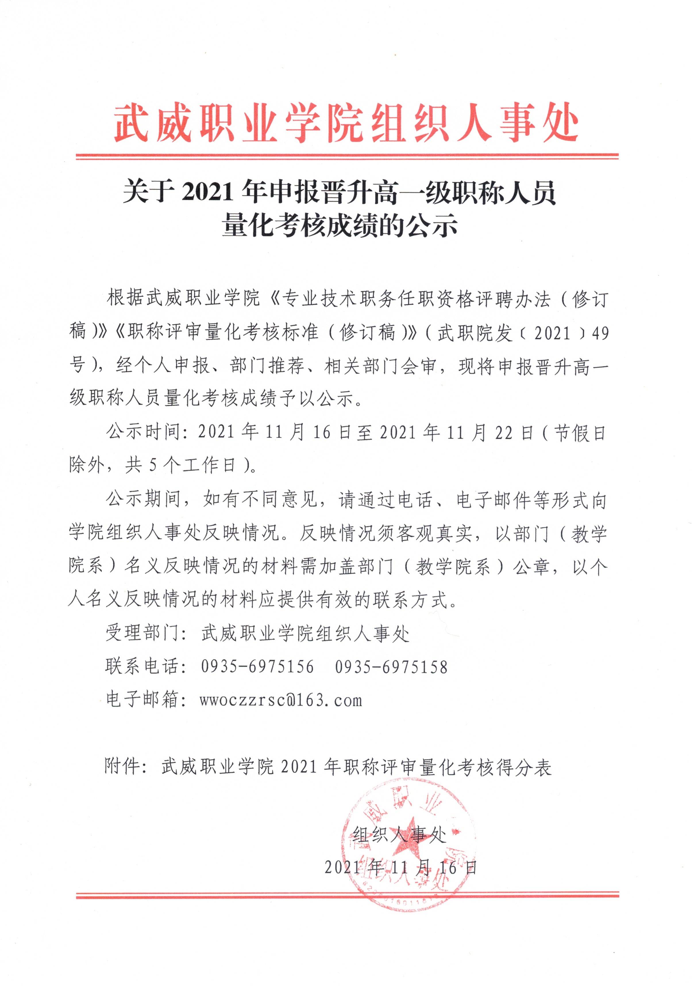 關于2021年申報晉升高一級職稱人員量化考核成績的公示