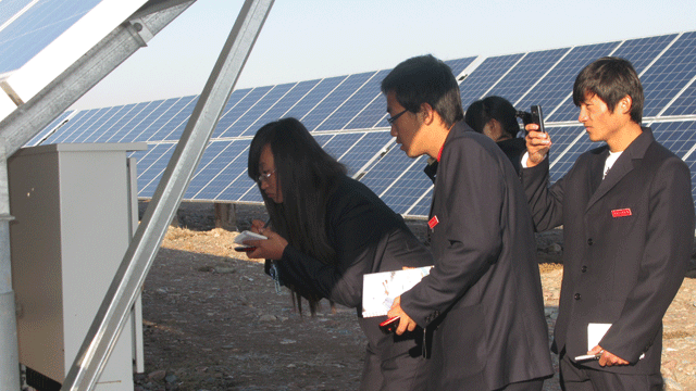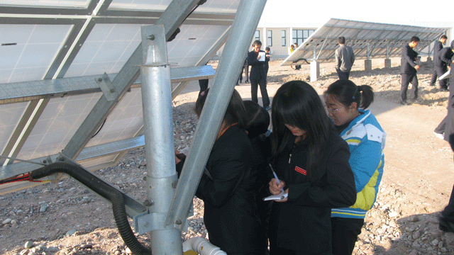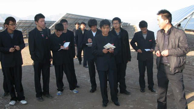 在觀摩學習過程中,全體師生受到了園區(qū)管委會工作人員的熱情接待,管委會張國偉主任帶領(lǐng)師生參觀了中節(jié)能甘肅武威太陽能發(fā)電有限公司,公司負責人向大家介紹了園區(qū)建設(shè)情況,從多晶硅、單晶硅的提煉、太陽能電池板的生產(chǎn)制造到光伏電站的建設(shè),對光伏發(fā)電產(chǎn)業(yè)鏈進行了較詳盡的講述。同學們看到園區(qū)內(nèi)一排排整齊擺置的太陽能電池板方陣時,都流露出激動崇敬的神情,一個個邊走邊看,并伸手觸摸太陽能電池板。同學們就光伏發(fā)電的原理、電池使用壽命、光電轉(zhuǎn)換效率以及光伏電站的運行維護等方面的專業(yè)知識向負責人請教,面對大家的疑問,園區(qū)負責人都耐心細致的做了解答。