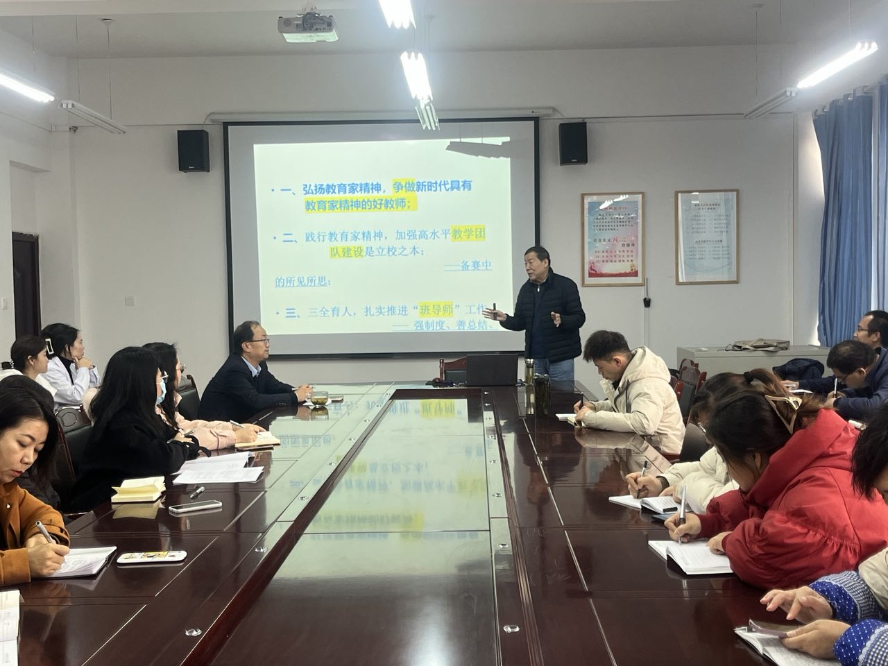 楊存忠教授主要從“弘揚教育家精神,爭做新時代具有教育家精神的好老師”、“踐行教育家精神,加強高水平教學(xué)團隊建設(shè)”、“三全育人,扎實推進班導(dǎo)師工作”以及“如何上好一堂課”四部分展開。楊存忠教授解讀了中國特有教育家精神的內(nèi)涵;闡述了堅持師德師風(fēng)第一標準,大力弘揚教育家精神的重要意義和基本要求;結(jié)合典型案例,以案為戒,勉勵新時代教師既精通專業(yè)知識、做好“經(jīng)師”,又涵養(yǎng)德行、成為“人師”,努力做精于傳道授業(yè)解惑的“經(jīng)師”和“人師”的統(tǒng)一者。楊存忠教授還就如何上好一堂課與老師們進行了深入交流。