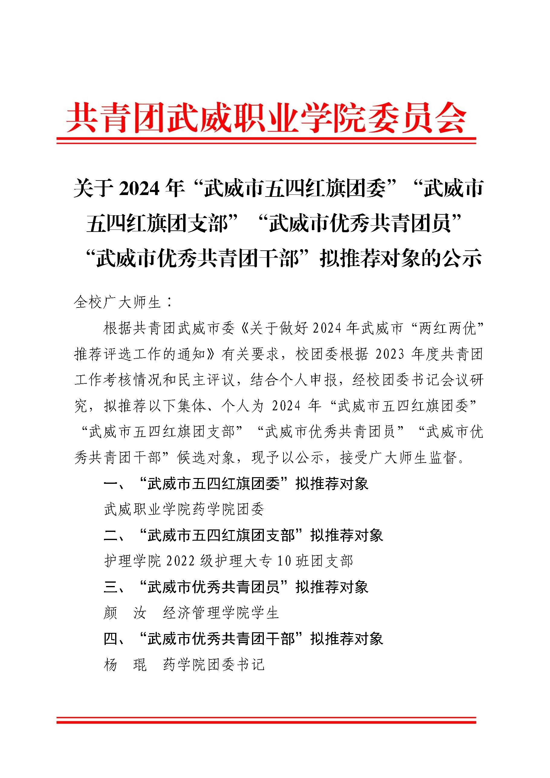 關(guān)于2024年“武威市五四紅旗團(tuán)委”“武威市五四紅旗團(tuán)支部”“武威市優(yōu)秀共青團(tuán)員”“武威市優(yōu)秀共青團(tuán)干部”擬推薦對(duì)象的公示