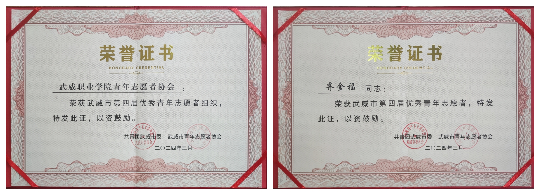 會議全面總結了2023年全市青年志愿服務工作情況,對獲得武威市第四屆優(yōu)秀志愿者組織和個人的集體和單位頒發(fā)榮譽證書。我校青年志愿者協(xié)會被評為“優(yōu)秀志愿者組織”,工程技術學院學生齊金福被評為“優(yōu)秀志愿者”。
