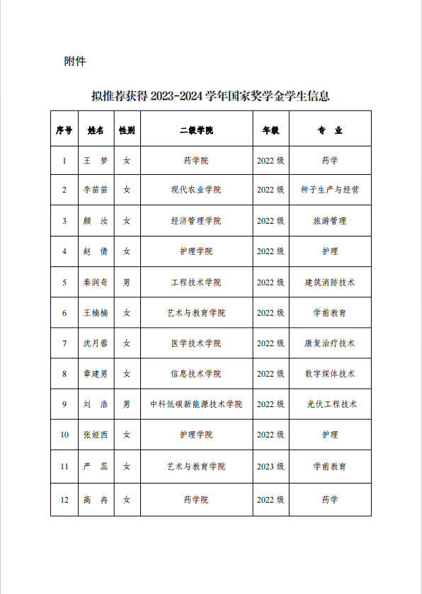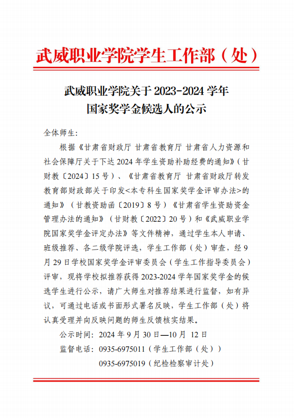 武威職業(yè)學院關于2023-2024學年國家獎學金候選人的公示