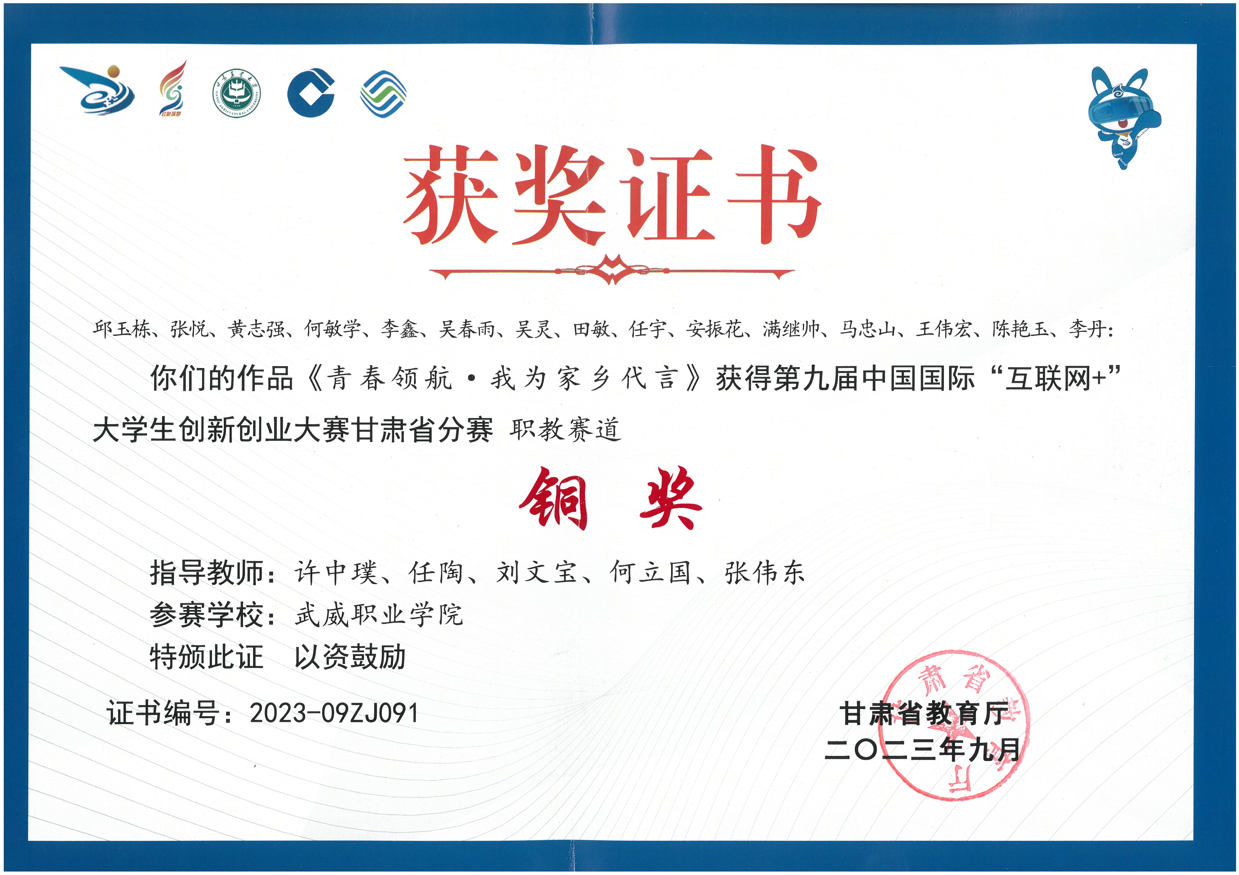 第九屆中國國際“互聯(lián)網(wǎng)+”大學(xué)生創(chuàng)新創(chuàng)業(yè)大賽甘肅省賽區(qū)銅獎
