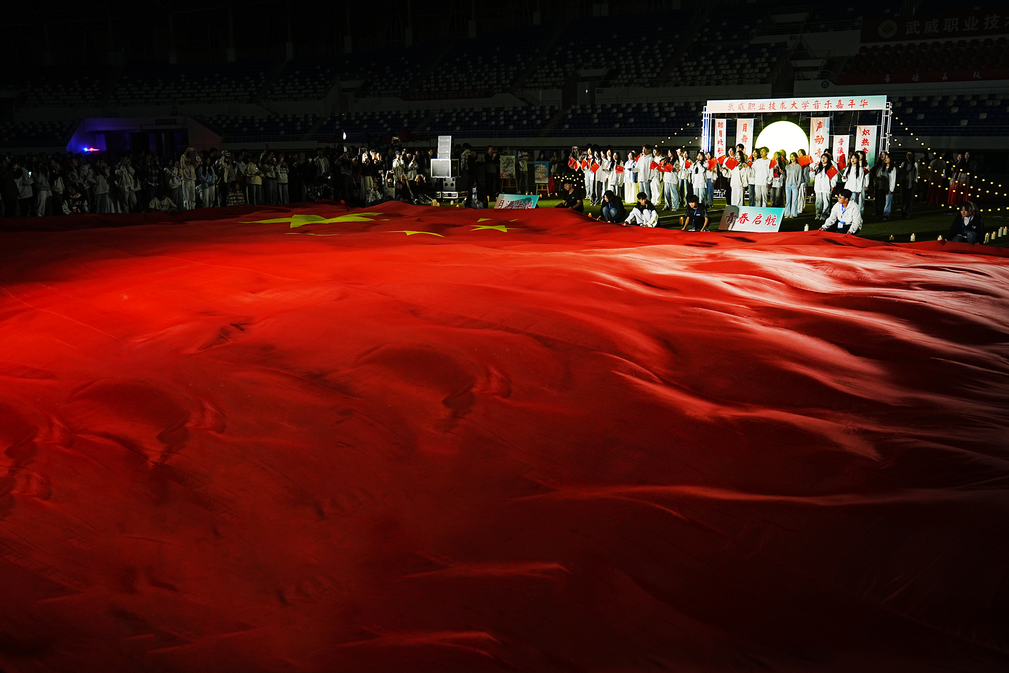 活動尾聲,在深情的旋律中,演職人員與觀眾齊聲合唱《如愿》,深切表達對國泰民安的美好祝愿。巨幅國旗在師生手中緩緩傳遞、飄揚舞動,匯成一片莊嚴而溫暖的紅色海洋,將現(xiàn)場氛圍推向最高潮,展現(xiàn)出青年一代與時代同頻、與祖國同行的堅定信念。