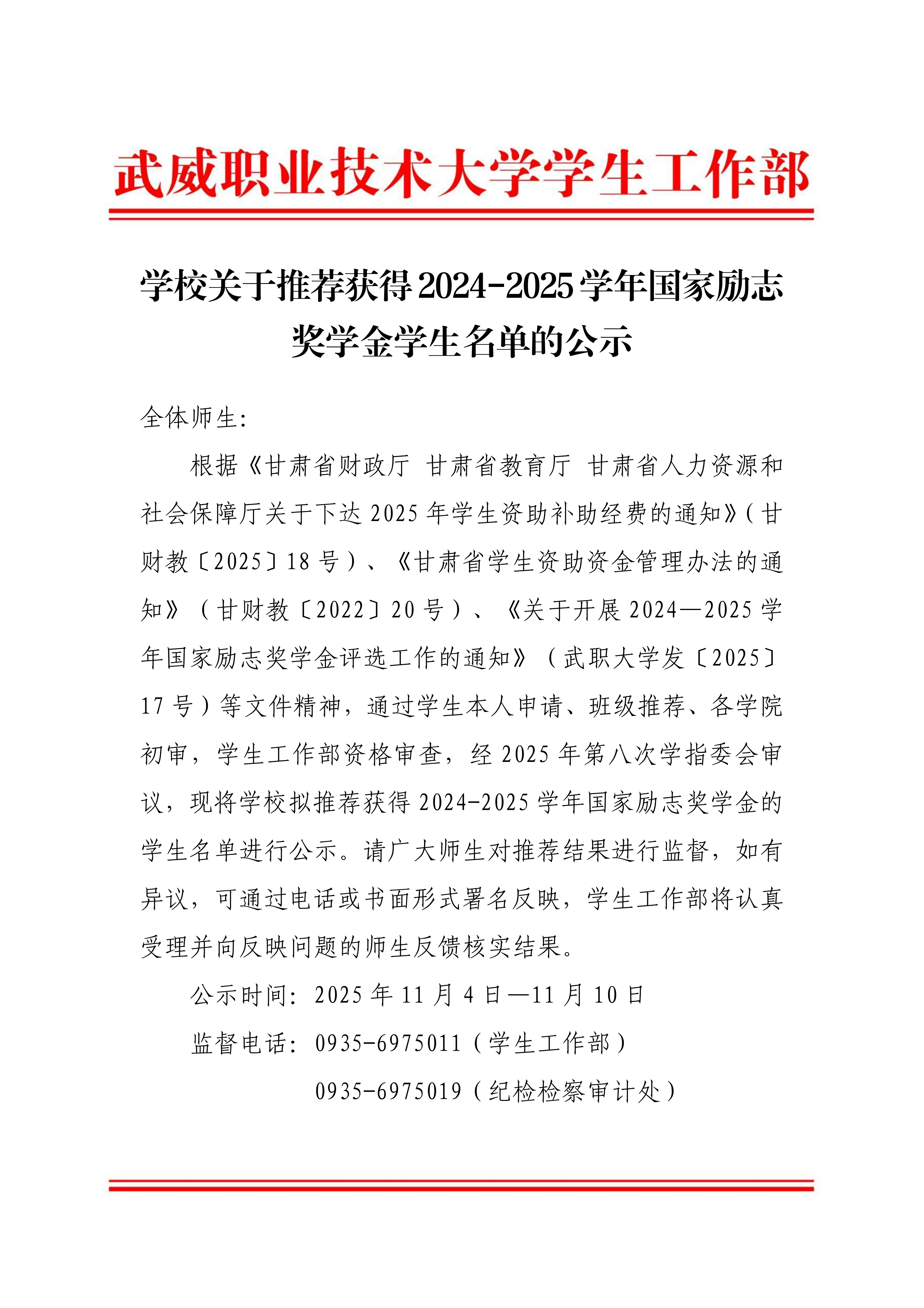 武威職業(yè)技術(shù)大學關(guān)于2025年學校助學金評選結(jié)果…