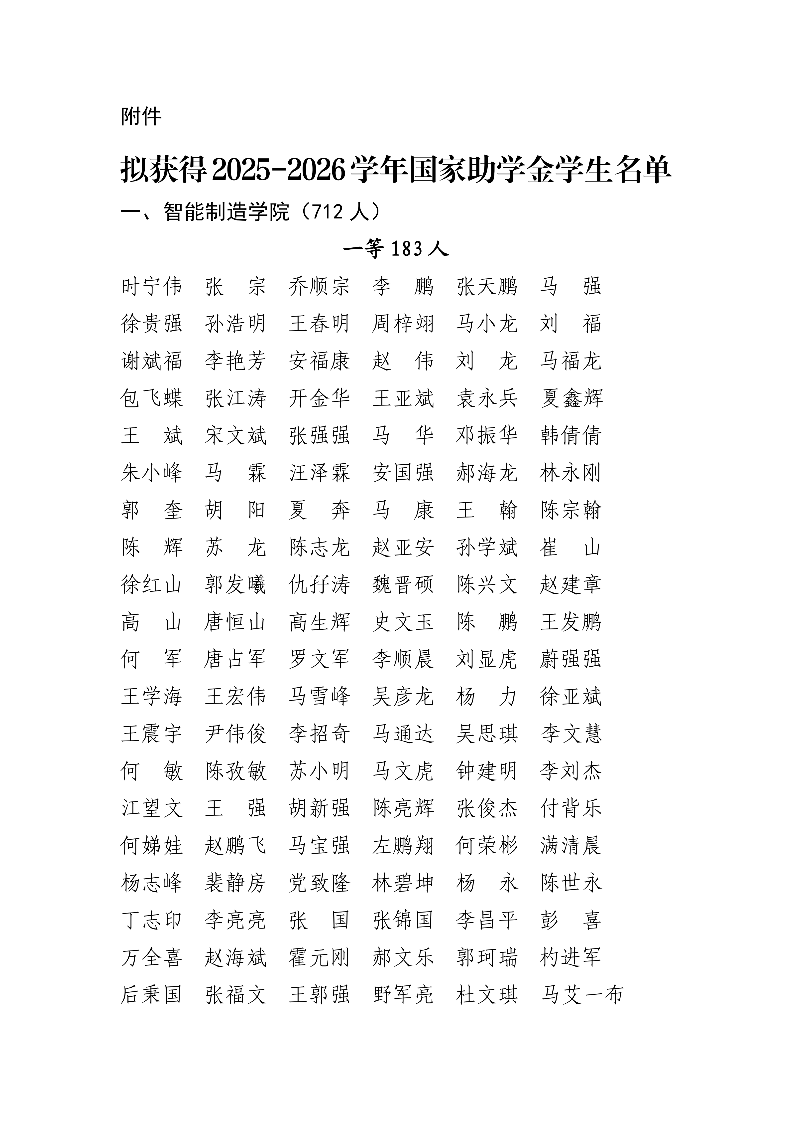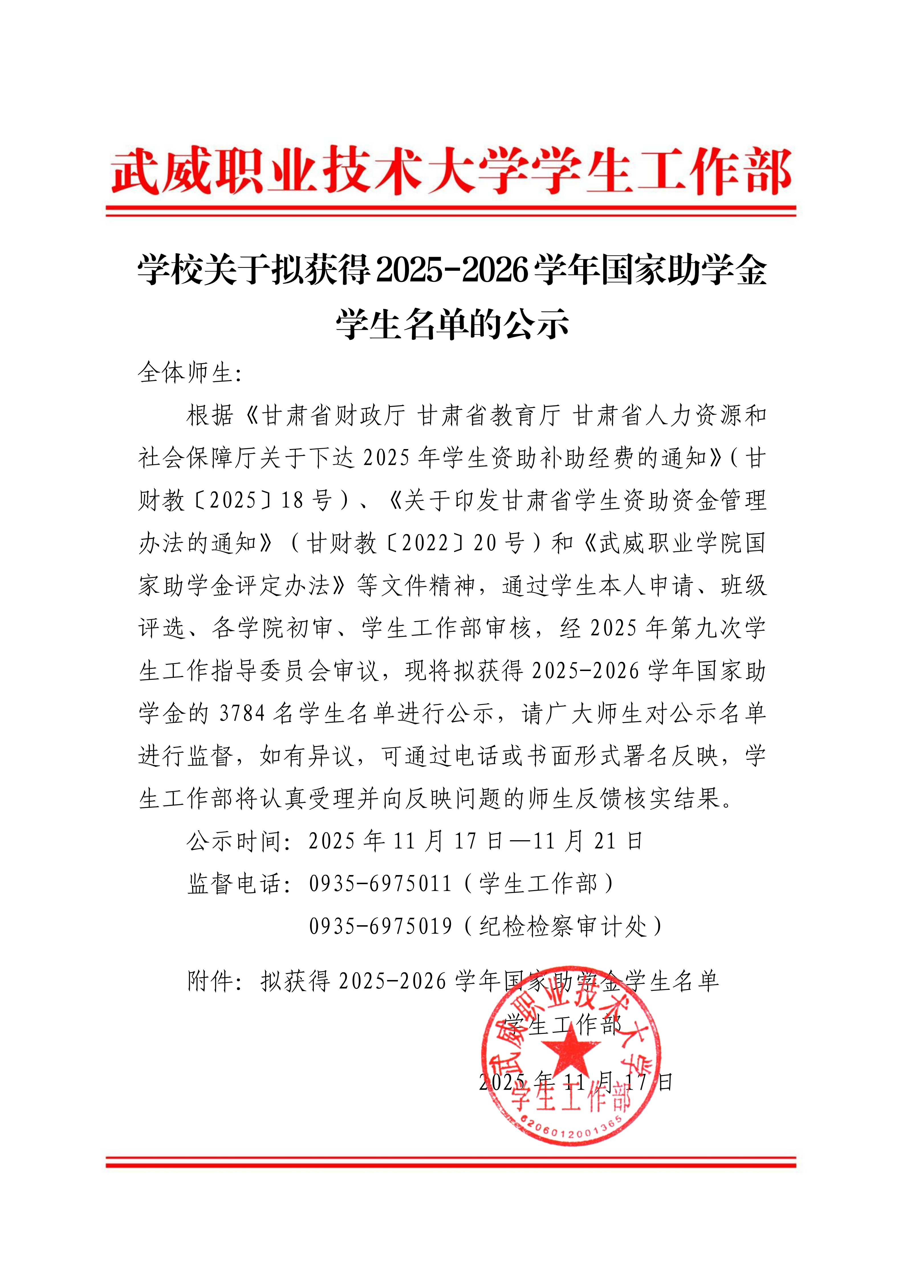 學校關于擬獲得2025-2026學年國家助學金學生名單的公示