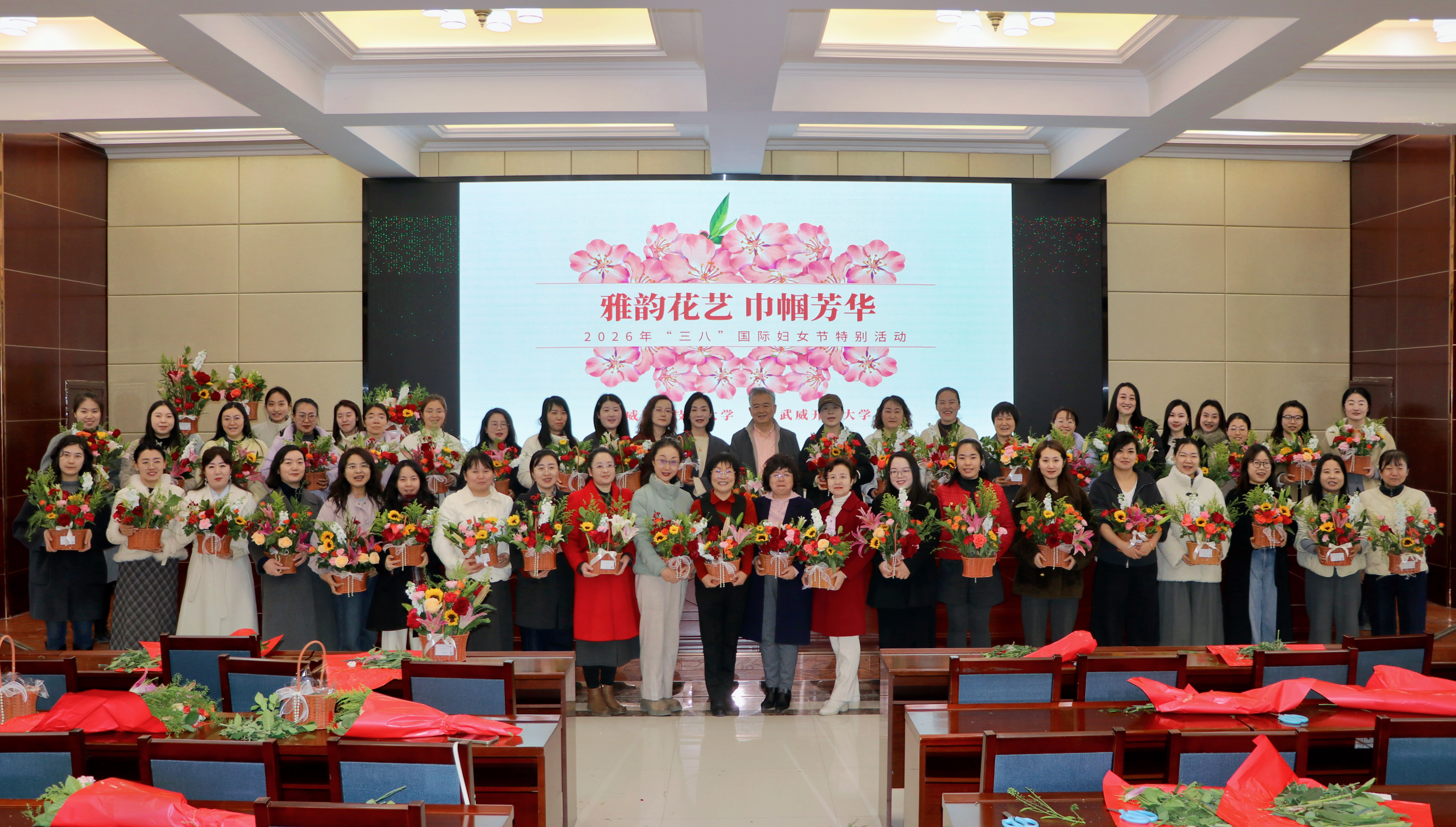為慶祝第116個“三八”國際勞動婦女節(jié),3月6日,學(xué)校工會聯(lián)合武威開放大學(xué),在行樹樓北側(cè)報告廳組織開展了以“雅韻花藝?巾幗芳華”為主題的插花活動,130余名女教職工歡聚一堂、共赴花約。黨委委員、副校長何毅出席活動并致辭。
