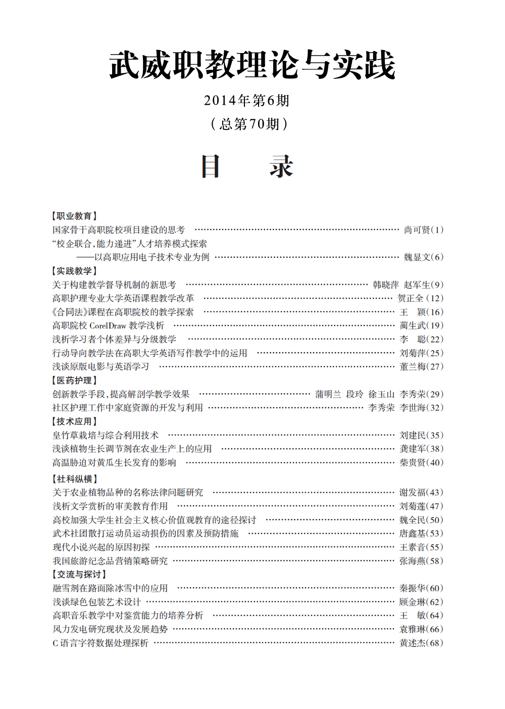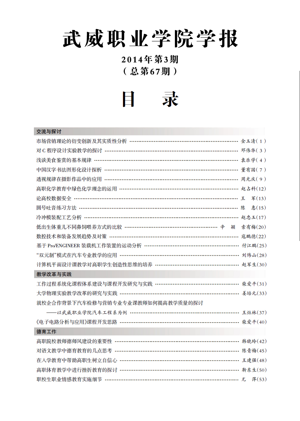 2014年《武威職業(yè)學(xué)院學(xué)報》目錄