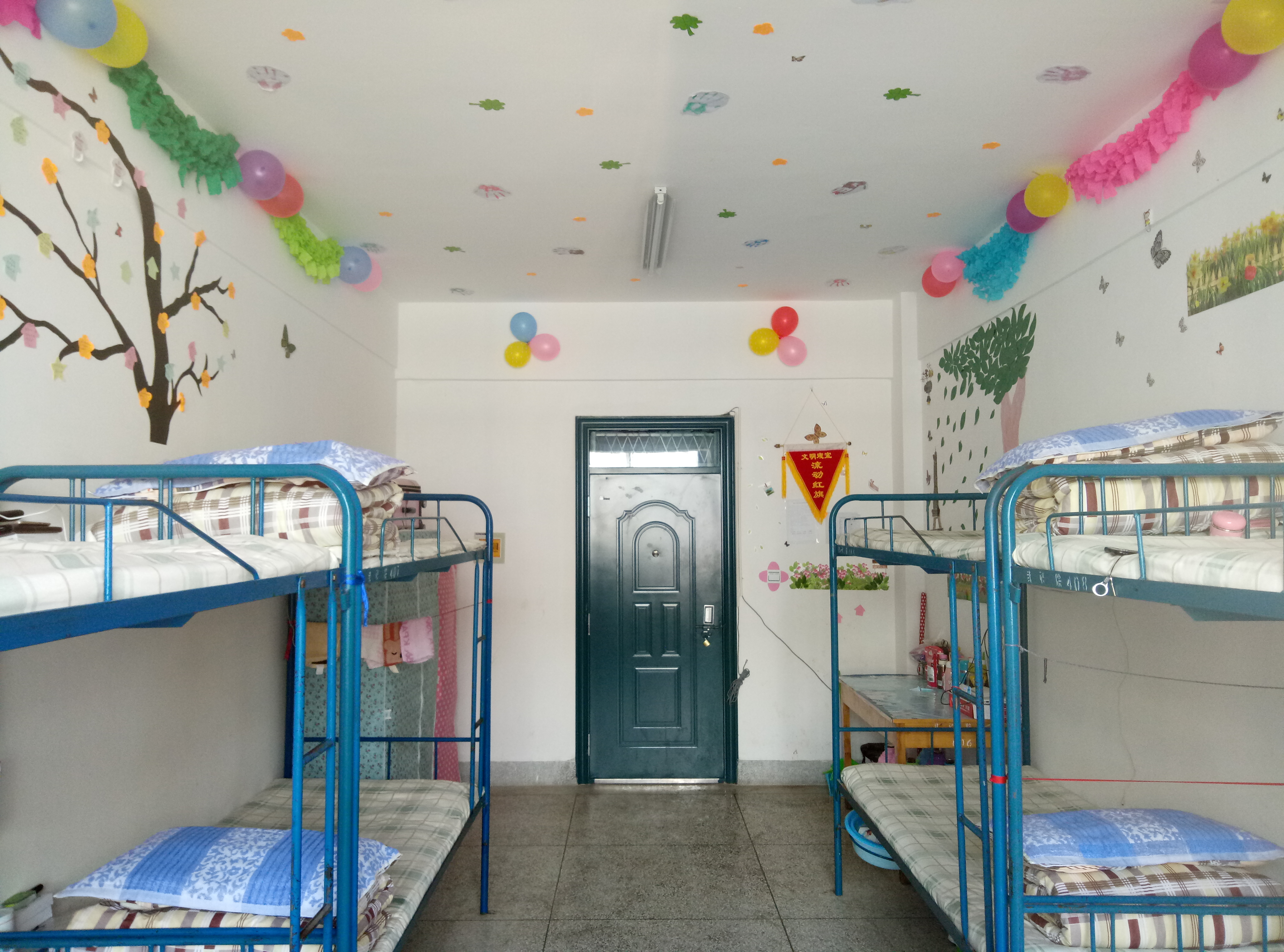 各宿舍衛(wèi)生狀況普遍較好,基本做到了勤開窗,勤掃除,被褥疊放整齊,地面、桌面干凈整潔,用電合理、安全。同學(xué)們大膽創(chuàng)新利用剪紙、剪花、圖貼等手工作品將宿舍裝扮得優(yōu)雅而漂亮。也有同學(xué)用書法、繪畫作品裝扮宿舍,為宿舍增添了藝術(shù)的氣息。