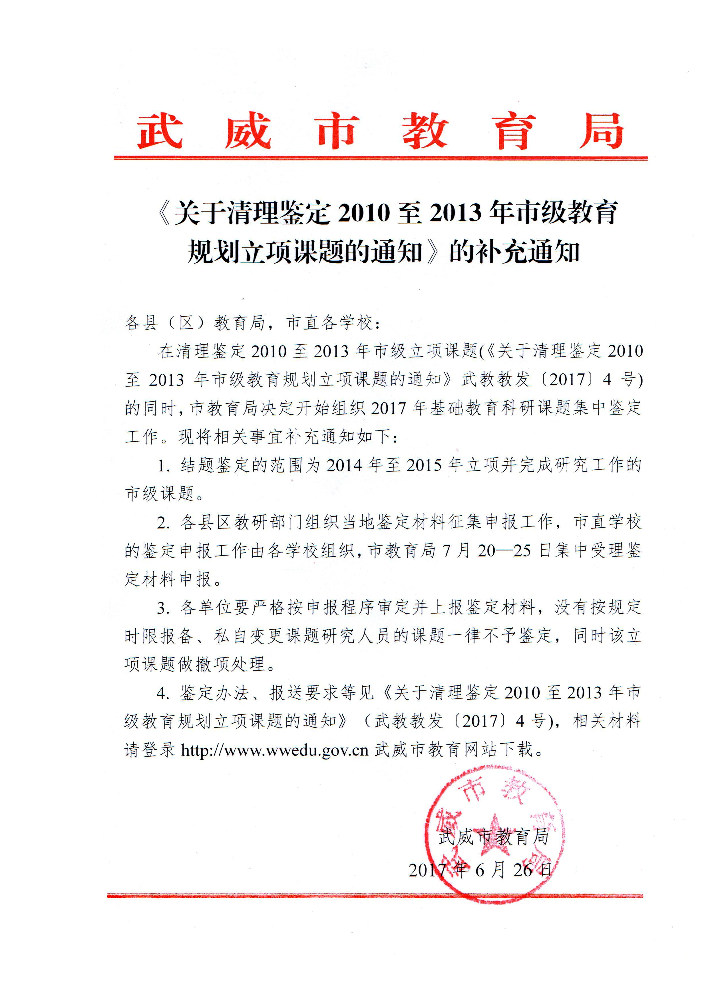 轉(zhuǎn)發(fā)武威市教育局《關(guān)于清理鑒定2010至2013年市級(jí)規(guī)劃立項(xiàng)課題的通知》的補(bǔ)充通知