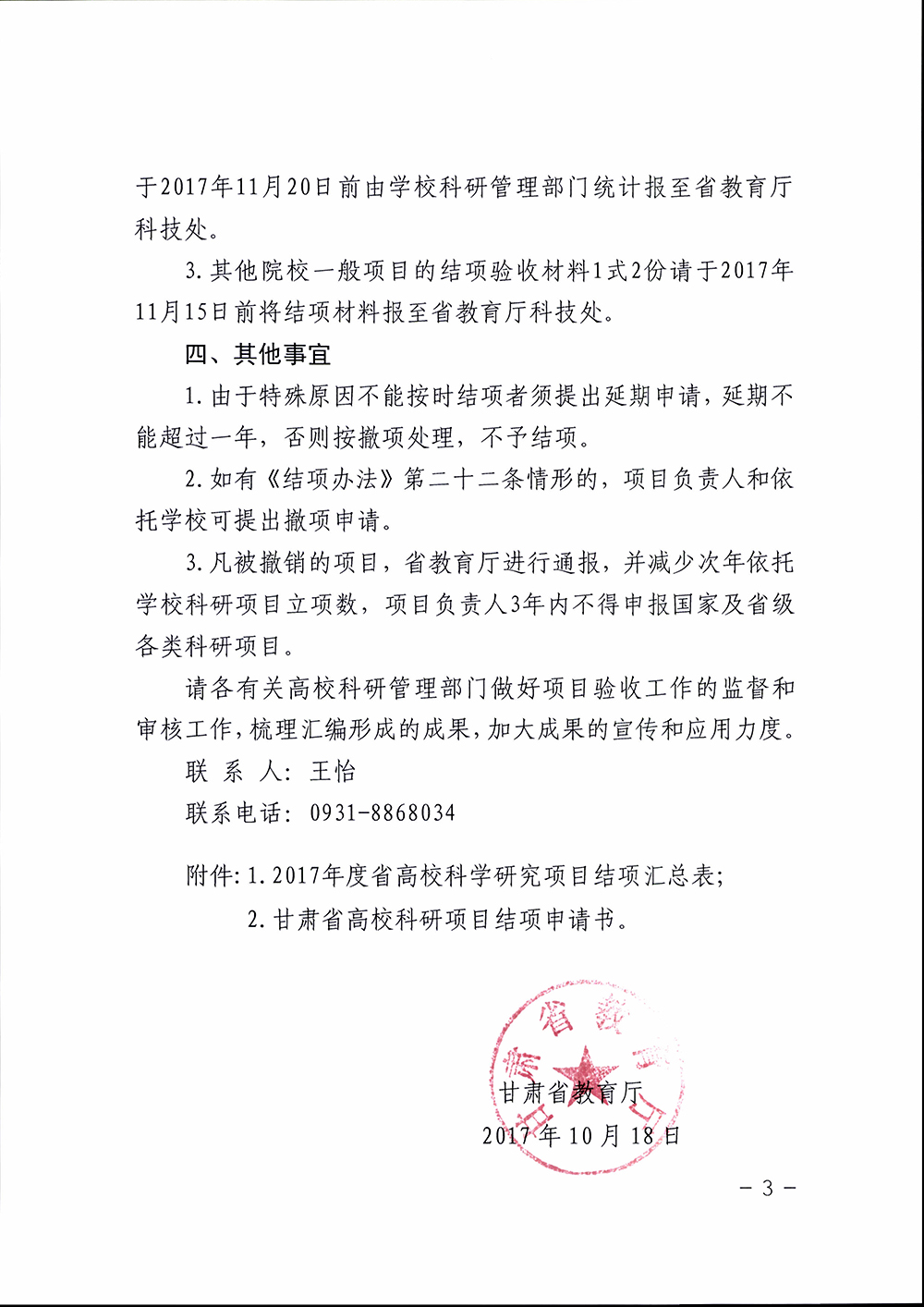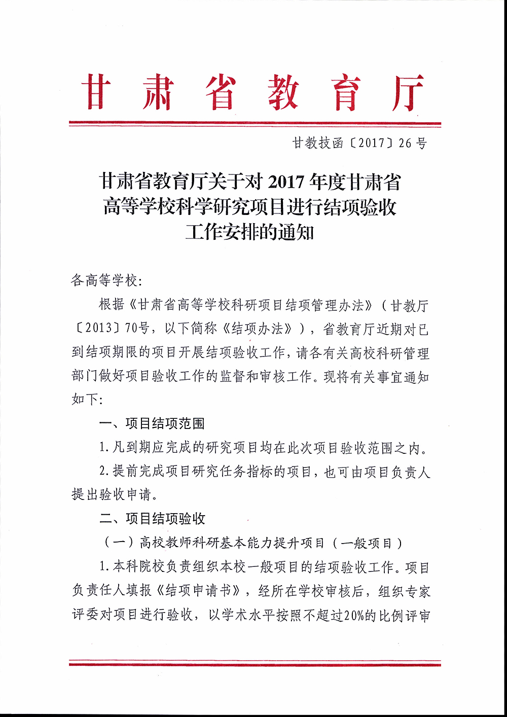 轉(zhuǎn)發(fā)甘肅省教育廳關(guān)于對(duì)2017年度甘肅省高等學(xué)校科學(xué)研究項(xiàng)目進(jìn)行結(jié)項(xiàng)驗(yàn)收工作安排的通知